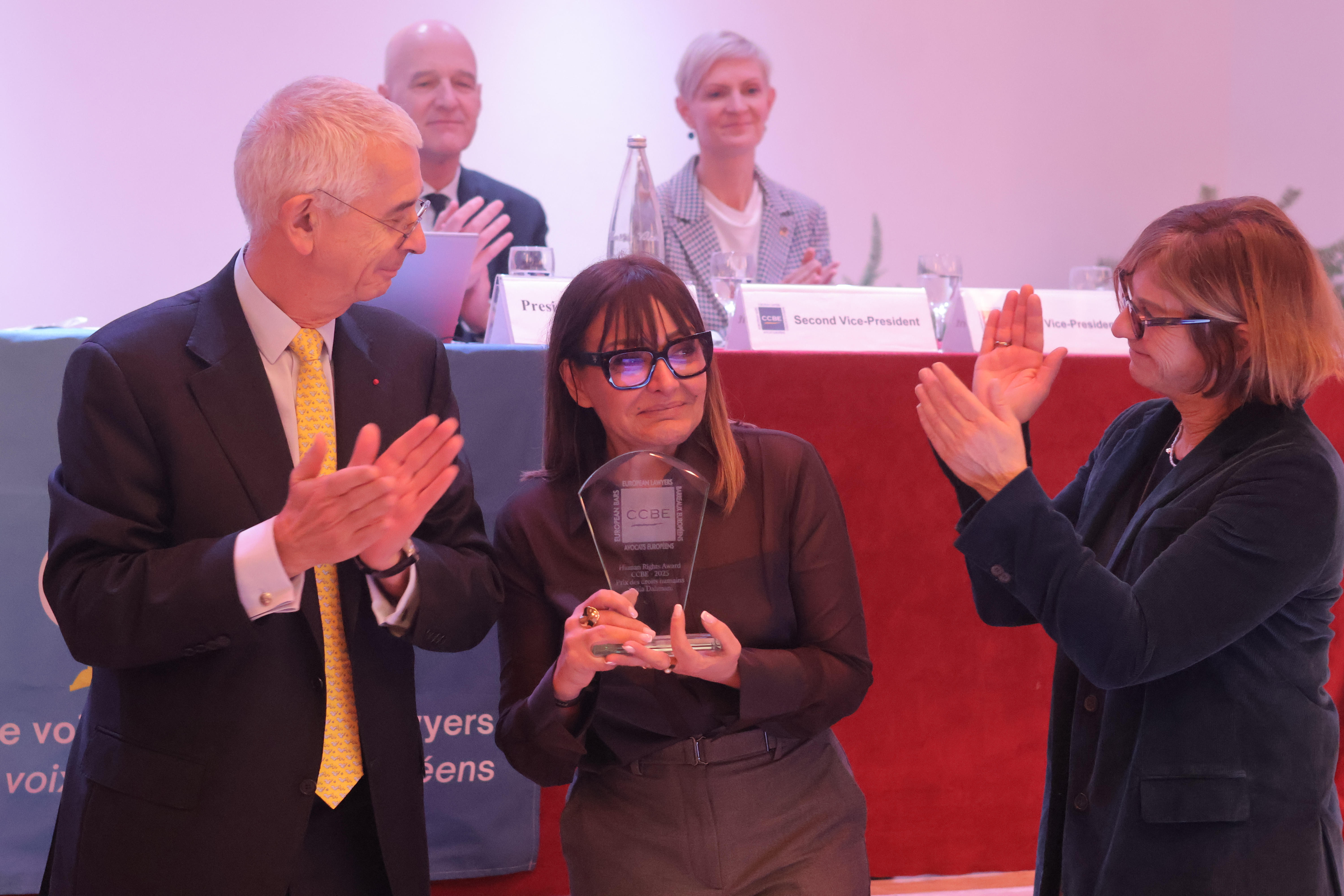 Stemningen i salen var præget af både glæde og lettelse i Paris den 27. november, da den tunesiske advokat Sonia Dahmani blev hædret med den årlige menneskerettighedspris fra CCBE – sammenslutningen af europæiske advokatsamfund.
