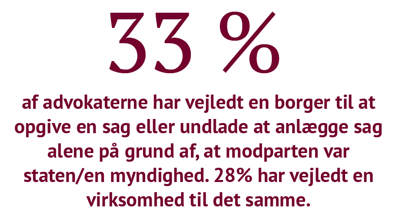 Det opleves som en tung og ulige kamp at føre sager mod staten og offentlige myndighed. 3% af borgerne og 6% af virksomhederne fortæller, at de har opgivet at føre sager de seneste to år, og hhv. 33% og 28% af advokaterne har frarådet en borger eller virksomhed at gå rettens vej alene, fordi modparten var det offentlige. 73% af advokaterne mener, at borgere generelt har for svært ved at få medhold mod det offentlige, og det samme mener 63% af virksomhederne.
