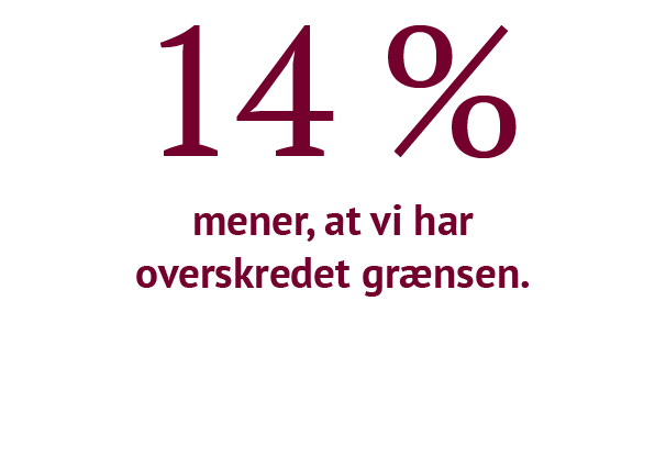 Et substantielt spørgsmål er, hvor grænsen går. Henholdsvis hver tredje advokat advarer mod negative retssikkerhedsmæssige konsekvenser af regeringens tryghedspakke og hver anden advarer om potentielle konsekvenser ved en udvidelse af PET-loven. Samtidig mener 45% – altså næste halvdelen – af borgerne, at grænsen for, hvor meget overvågning der er rimeligt, enten er nået eller overskredet, og 20% har lav eller ingen tillid til, at myndighederne overholder loven, når de behandler borgernes data.